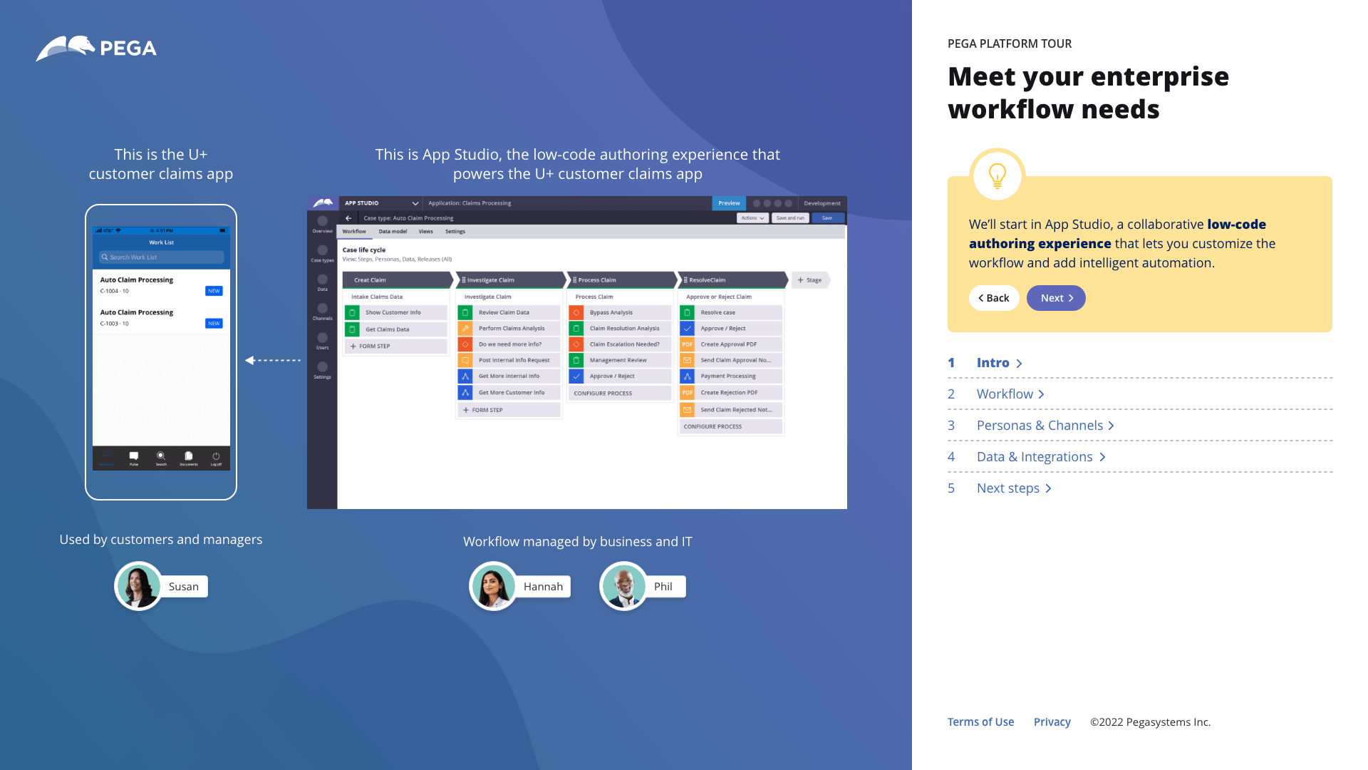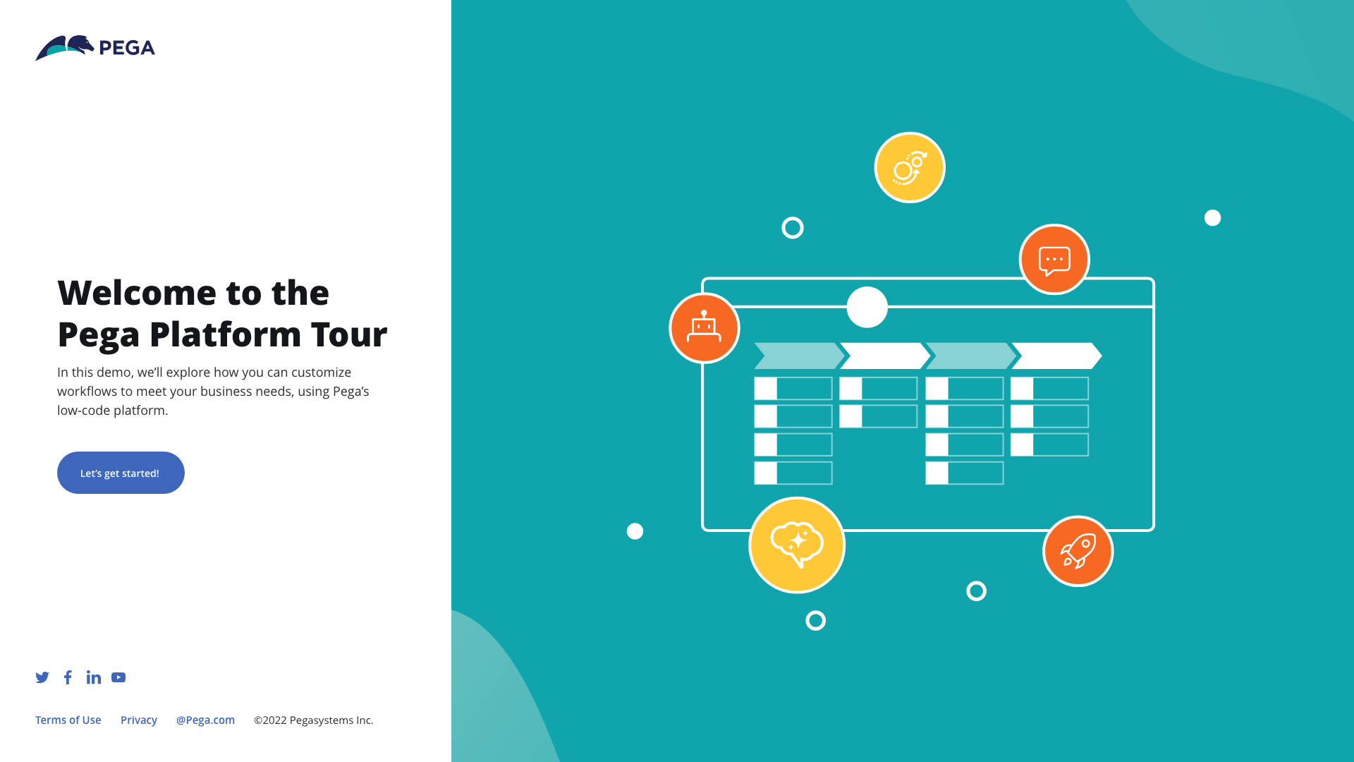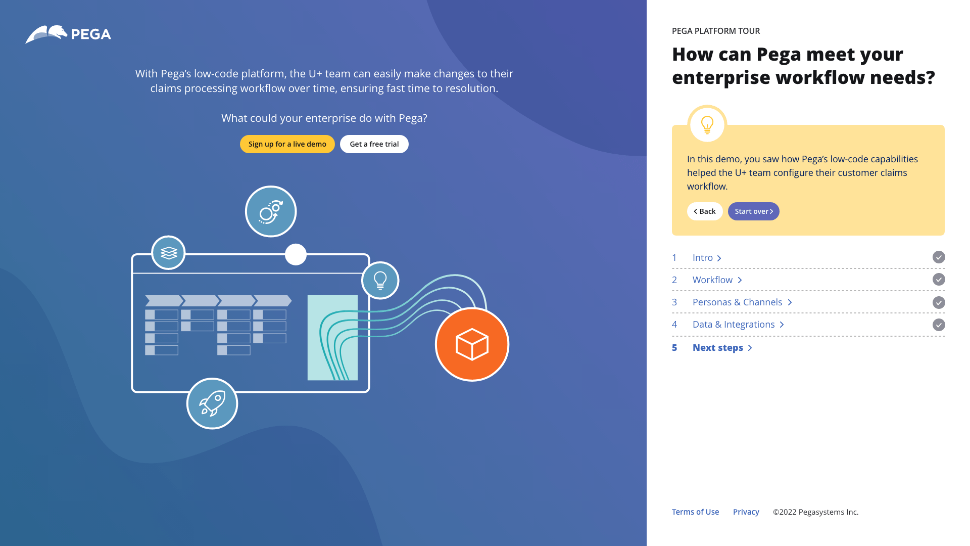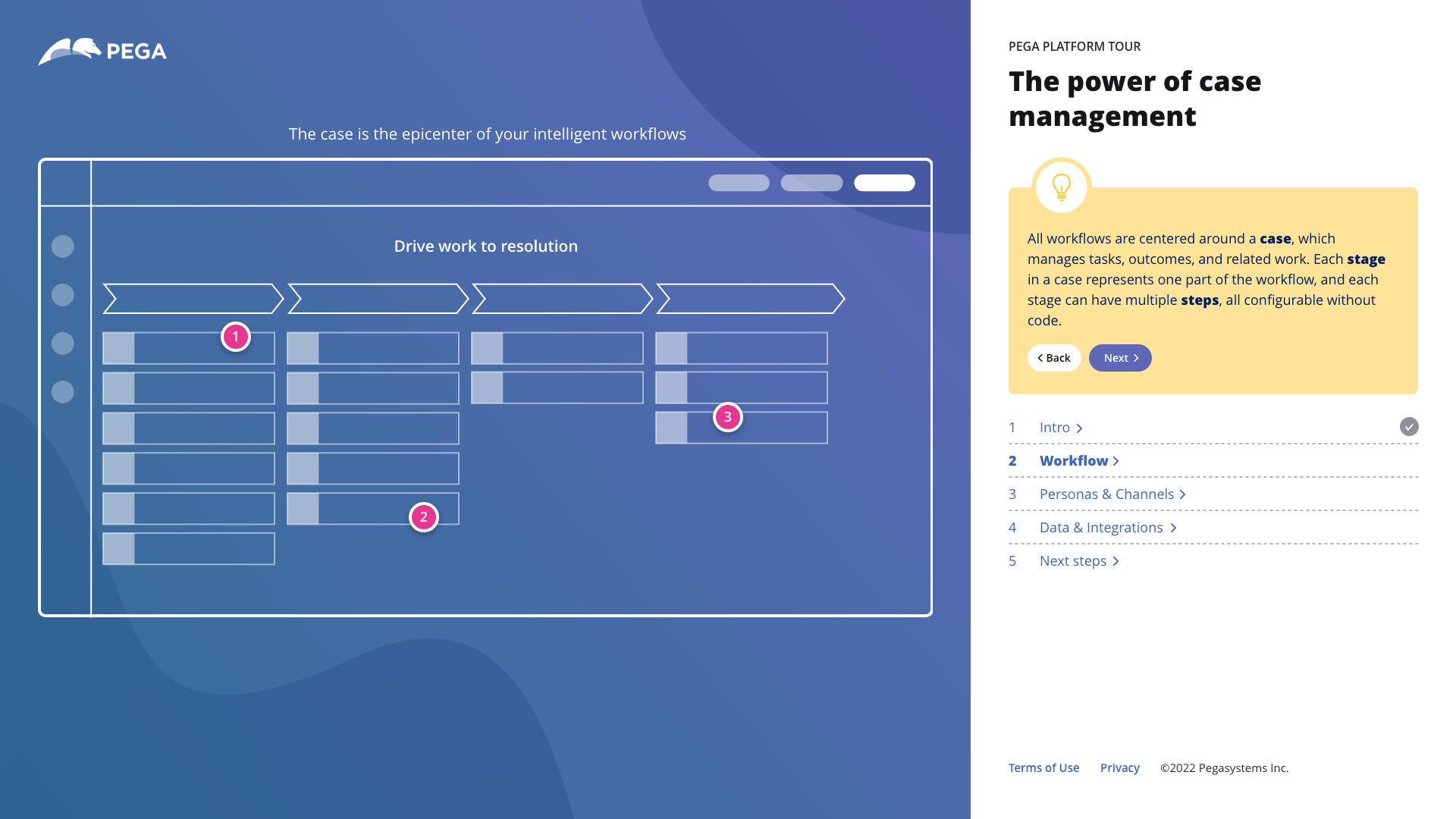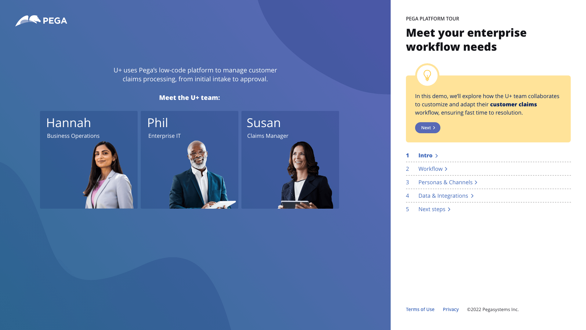 An interactive experience I had worked on that give pega.com visitors a tour of the Pega Platform. It orients visitors to the UI and ties key capabilities to specific business examples. You can check out the live version.